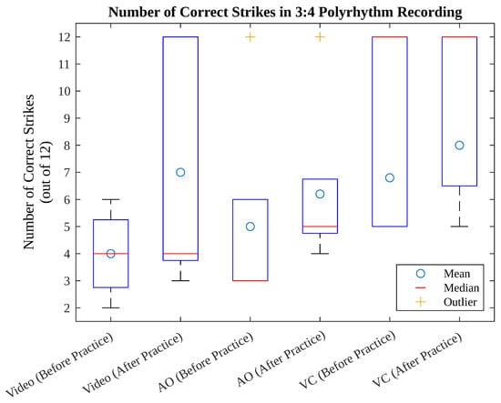 In Figure 19, the before and after data for the 3:4 polyrhythm are shown. In both figures, all practice modes show improvement, with some cases reaching the corresponding maximum number of hits (eight or twelve). In terms of the median and mean, the vc group’s after-practice session results outperformed the Video group’s results, whereas only the ao group’s median was higher then the Video group’s. The Video group’s mean result after the practice session was higher than the ao’s after-practice session mean.