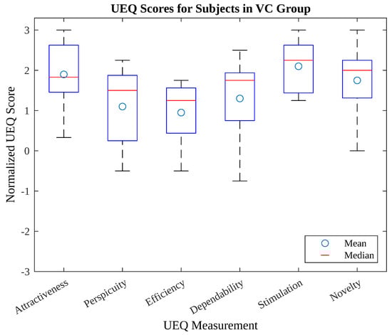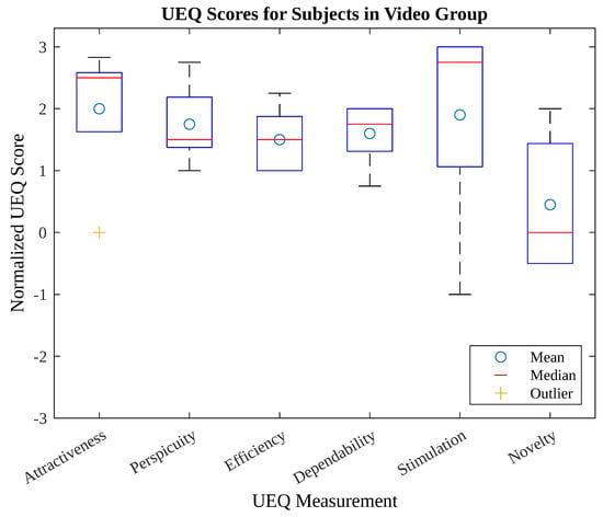 The UEQ survey was used to to measure each subject’s evaluation of the user experience. After each subject used the electronic drum pads and either the video, ao, or vc tools, an experience that lasted about 30 min, the 26-question survey was administered. Through UEQ data analysis tools, the results were organized into six factors, and a high-level comparison can be seen in Figure 20, Figure 21 and Figure 22. The data’s range was scaled from −3 to +3, and as shown, the subjects’ response to the video was mostly comparable with the two vr experiences. Exceptions included perceived novelty, where the vc group’s mean achieved a score 1.3 points higher than that of subjects using video, and efficiency, where the Video group’s mean achieved a score 0.55 points higher than the vc group.