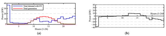 Figure 7 shows the modified demand along with the power produced and demanded by the households (without EVs). The modified demand includes the initial demand, the ESS, and the EVs. In Case 1 (Figure 7a), the best values of SC (79.10%) and SS (53.30%) are reached. Lower values are reached in Case 2 (SC is 58.16% and SS is 39.19%), Case 3 (SC is 62.88% and SS is 42.36%, which outperform those obtained in Case 2), and Case 4 (SC is 57.75% and SS is 38.91%).