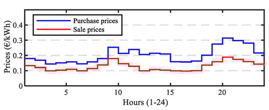 Besides technical data, economic data regarding the purchase or sale of electrical energy are vital to performing an EMS. The reduction in the electricity bill or the increase in profits derived from surplus energy sales constitutes the most important motivation for consumers, prosumers, producers, and other stakeholders to participate in aggregating initiatives. The price of the purchased/sold energy varies with the kind of stakeholders and local regulations in the country. In liberalized market scenarios, prices vary according to a bidding process depending on offer/demand in each scheduled period. In contrast, the commercial offers of retailers to small consumers can be flat or time-of-use tariffs. In any case, the cost of the bought electric energy is usually higher than the price of the sold energy because consumers pay for other power system costs in addition to the energy consumed. In Spain, based on the Iberian electricity market MIBEL coordinated by Spain and Portugal, there are regulated prices that follow the day-ahead market prices for small prosumers who prefer this option to retailers’ offers. These prices are different for purchased energy and sold energy, and the difference is based on general power system costs. Figure 3 shows a daily profile for these prices in Spain, published in the information system of the Spanish System Operator [41] for 1 February. The prices in Figure 3 have been used in the objective functions in this work. A daily bill of EUR 23.47/day for the whole VPP is obtained as the base case when prices in Figure 3 are applied to power values in Figure 2b.