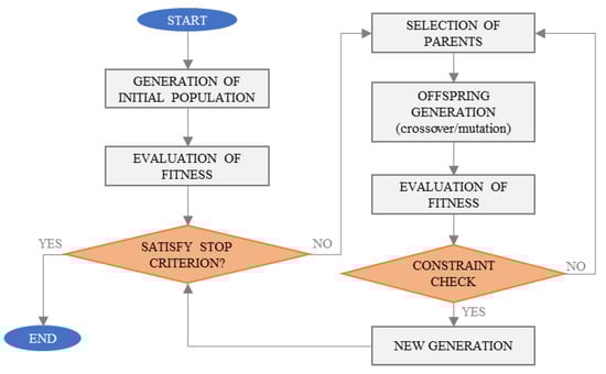 The GA was inspired by evolutionary theories to find a solution for an optimization problem emulating a natural selection process. A random initial population was created as a set of possible solutions (chromosomes). Then, the GA sequentially created new populations by selecting the best individuals according to their fitness values after crossover and mutation operations. After a sufficient number of generations, the GA aimed to find a solution for the optimization problem. The GA was considered to provide powerful search characteristics for large, complex search spaces without requiring full knowledge of the problem domain [20]. Its flexibility and ability to find near-optimal solutions encouraged its use in EMS optimization procedures [28]. Using crossover and mutation operations, a parallel search was performed by GA from the initial population. Thus, it has the ability to avoid being trapped in local optimal solutions, unlike traditional methods that search from a single point. The augmented Lagrangian genetic algorithm constraint solver provided by Matlab® was used to handle constraints in this paper. Figure 4 presents a flow chart of the GA used.
