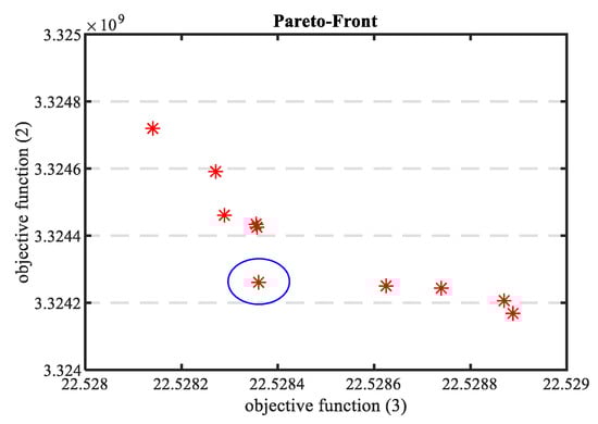 As a double target is pursued, a fourth case was studied for comparison, which combines both economic and technical targets in a multi-objective optimization process with a GA. The objective functions f1 (2) and f2 (3) and the constraints of Cases 1 and 2 are used. Figure 5 shows the Pareto front obtained in the process. Each point in the Pareto front represents one possible solution for the problem. The fitness value of both objective functions for each solution is depicted. The marked point of the Pareto front is considered a good trade-off solution, as it provides a low fitness value for both objective functions without prioritizing either of them.