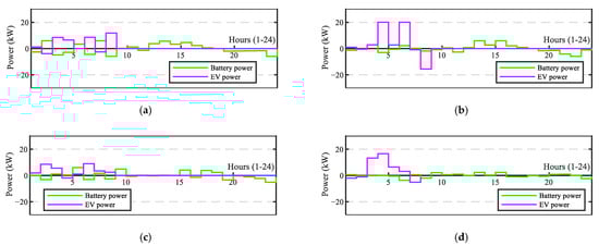 Power scheduled for the ESS and EVs: (a) Case 1; (b) Case 2; (c) Case 3; (d) Case 4.