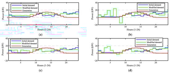 Accumulated demand and generation after scheduling: (a) Case 1; (b) Case 2; (c) Case 3; (d) Case 4.