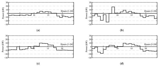 Power interchange with the distribution grid: (a) Case 1; (b) Case 2; (c) Case 3; (d) Case 4.