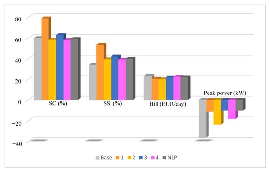 For the sake of comparison, constrained non-linear programming (NLP) has also been used with the same objective function and constraints as in Case 3. It is well known that classic gradient-based optimization methods, often used in the literature for problems similar to the one proposed here, are liable to fall into local minima. The obtained result can be summarized in SC and SS values of 59.02% and 39.77%, respectively, and an electricity bill of EUR 22.15/day, while the peak power is restricted to 10 kW. Figure 10 compares the obtained results with the cases in Table 2. In this figure, the best option proposed (Case 3) is highlighted in blue. Light grey represents the base case (without either ESS or optimization), dark grey is related to NLP, and other colors were selected for the remaining cases. NLP provides worse results than Case 3 in terms of both SC and SS, as well as in terms of savings. This result confirms the initial assumption that the GA outperforms traditional optimization methods in this kind of problem, with a large search space and scarce initial information about the optimal solution.