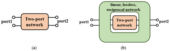 (a) Basic two-port network. (b) The two-port network of an embedded linear, lossless, reciprocal feedback network.