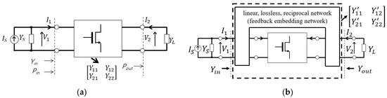 In electronics, U is a measure of the quality of transistors, which is given in (3) with Y-parameters [24]. The is equal to U when the transistor is unilateralized. Figure 2b shows an example of the quasi-linear model with a feedback network. The feedback embedding network is also modeled as Y-parameters; to distinguish it, it is represented by []. The linear, lossless, reciprocal feedback network does not change the value of U [25].