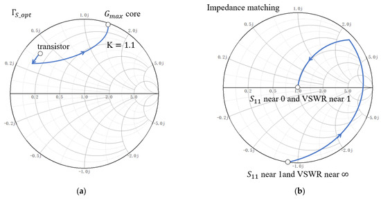 The real part of optimal source impedance ZS_opt is shown as (13). It is zero when K = 1, so the optimal source reflection coefficient ΓS_opt is located on the edge of the Smith chart, which is shown in Figure 4a. In cases where K < 1, achieving simultaneous conjugate impedance matching becomes impossible. This is illustrated in Figure 4b, which depicts S11 and VSWR during conjugate matching; the matching process is close to the edge of the Smith chart. As a result, impedance matching necessitates a high degree of precision. As a result, if the reflection coefficient is located on the edge of the Smith chart, impedance matching to 50 Ohm cannot be realized with lossless components; thus, a lossy impedance matching network must be used. If the power gain is very near to Gmax, the ΓS_opt is very near to the edge of the Smith chart; therefore, we can predict that impedance matching will be difficult to realize and that the impedance matching network will be quite narrow or lossy.