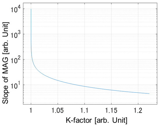 The sensitivity of is analyzed by differentiating with respect to K, and it is found that is sensitive when K near to 1. We derivate the by K to see the slope. The result is shown in (14). It is divided into two terms; the right term is infinite when K = 1. Thus, the value of will be infinite when K = 1. Subsequently, it is impossible for gain to achieve ; the gain will be limited by other conditions.