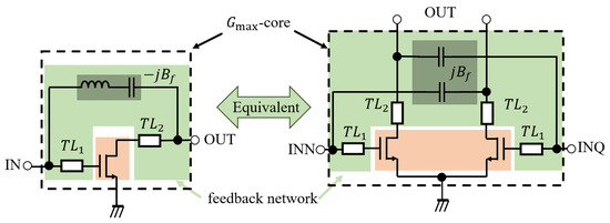 Several topologies of the feedback network can boost the power gain to [12,13,14,15,16]. Here, we use the topologies in Figure 6 as an example. Figure 6 shows equivalent single-ended and differential topologies. The feedback admittance -jB for the single-ended topology is equivalent to the jB for the differential configuration. Here, a comprehensive design theory for amplifiers is taken into account, including the consideration of stability. The amplifiers of the proposed two topologies are unconditionally stable. Regarding the two-port network, in this example, the embedding structure is parallel and cascade embedding. Cascade embedding, which is formed by and , can expand the scope of movement on the λ plane. In the single-ended topology, a series of connections involving the inductor and capacitor forms the negative parallel feedback susceptance −jBf. By the equivalent analysis of the two topologies, the cross-coupling of two capacitors forms parallel embedding, and the parallel feedback susceptance is reversed to jBf. We assume that the source and load impedance are simultaneous conjugate impedance matching so that the power gain is . The design process is demonstrated on a six-stage amplifier in Section 5. An NMOS (32 μm/40 nm in size) is created via a 40 nm bulk CMOS process. The fmax of the NMOS is about 275 GHz. The design frequency is 110 GHz. The U is 8.9 dB.