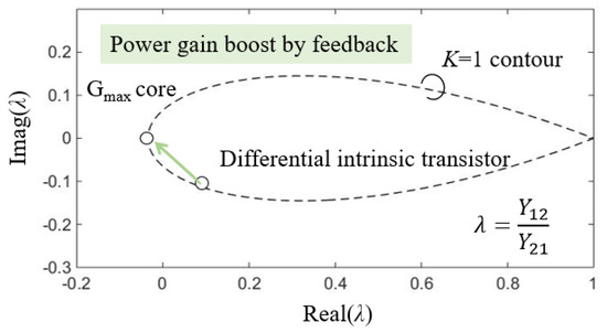 It is convenient and intuitive to design a feedback network on the λ plane [10,17]. The power gain of single-ended and differential intrinsic transistors can also be boosted to core via the feedback network. Figure 7 shows the gain boosted on the λ plane. Each capacitor and inductor on the feedback network can change the point location. The change in feedback network can be reflected on the λ plane via the following formula: λ =. We can judge the of an amplifier by analyzing how far the point of is from the point of the core. is 8.8 dB without a feedback network, and the is 14.6 dB.