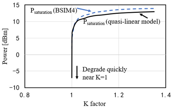 Using quasi-linear analysis and BSIM4 model analysis, simulate the saturation power. The quasi-linear analysis is formulated utilizing Y-parameters, while the BSIM4 model is a form of the SPICE model. Distinct modeling approaches account for the variance between the quasi-linear analysis and the BSIM4 model. The BSIM4 model takes the physical characteristics of the transistor into greater consideration. The simulation transistor has a channel length of 40 nm, and its total width is 32 μm when the multiplier is 4. Figure 8 shows the simulation result at 110 GHz, and the result using the BSIM4 transistor model is also shown for comparison. As predicted by (17) and (19), the saturation output power drops very quickly when K is approaching to 1. As the value of K deviates from 1, the saturation output power exhibits a relatively consistent stability. As depicted in Figure 8, under the same conditions, the saturation output power of the BSIM4 model is higher than that of the quasi-linear model. Nevertheless, when K approaches the vicinity of 1, both model outputs experience a rapid decrease in output power.