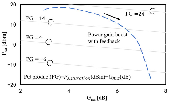 Based on the discussion above, it is not wise to boost the power gain very near to Gmax, so we would like to discuss the trade-off between the gain and output power. In order to create a more accurate representation of the actual situation, the simulation is based on a large signal with the differential topology. The saturation power versus Gma is drawn in Figure 9. The parallel slashes are the contour lines of the product (PG product), the step of which is 10. The PG products on the same contour lines are equal, and their calculation formulas are shown in the figure. A substantial PG product is attainable only when both and values are elevated. Through assessing the PG product, we can effectively achieve a balance between and . Furthermore, the PG product can be calculated with varying coefficients based on the actual circumstances.