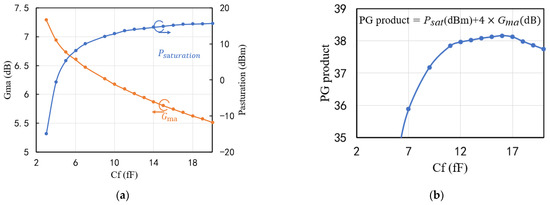 Figure 10a illustrates the variation in Gma and saturation output power as the feedback capacitor changes, where Cf represents the feedback capacitor. Due to the wide range of saturation output power variations, a coefficient of 4 is applied to Gma in order to ensure result coherence, resulting in the formula PG product = . Figure 10b shows the PG products versus different feedback capacitors. With a cross-coupling capacitor of 15.7 fF, there is a maximum PG product, making it suitable for constructing the feedback network. When the feedback capacitor is 15.7 fF, the calculated Gma is 5.8 dB, with a saturation output power of 15 dBm at 110 GHz. At this point, the saturation power does not experience a rapid decrease, indicating the effectiveness of our design.