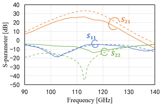 The proposed amplifier was fabricated via a 40 nm 10-Metal CMOS process and occupies an area of 820 × 950 (0.779). Its micrograph is shown in Figure 12. The chip was measured on wafer. The input and output were probed using the Cascade Infinity WR8 waveguide probe. Keysight PNA-X and VDI mm-Wave extender were used to measure the S-parameters. The measured result includes the input and output pads. The measured and simulated results of the S-parameters are shown in Figure 13. The peak gain is 26.5 dB at 112 GHz. is −18.5 dB at 102 GHz, and is −12.8 dB at 118 GHz. The measured bandwidth is 14 GHz (from 104 GHz to 118 GHz). Due to the decreases in input, output matching, balun, and transmission lines, the peak of is 7.8 dB lower than the simulated S-parameters.