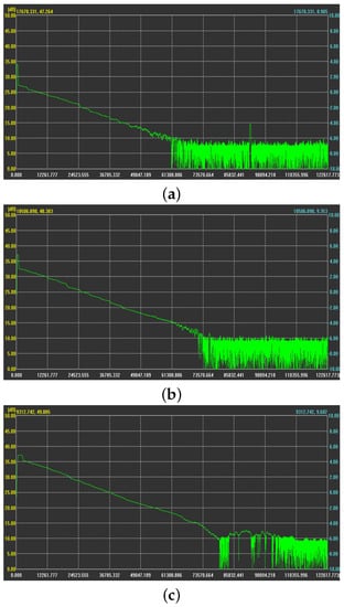 The threshold value given here is calculated as , and in which type, m is the scale; is the scale with noise variance of m. Generally speaking, the best value for c can vary with the different signals and the noise intensity. Experiments show that it is more appropriate to take c between 3 and 4 for ordinary signals [,], and here c = 3.4641.