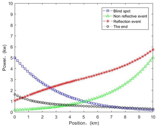 There are numerous reasons for fiber link failure, including fiber deformation due to external forces on the fiber, inadequate performance of the fiber itself, connector failure and external causes. To facilitate the analysis, we describe the fiber profile status of OTDR testing as event types containing blind spot, non-reflective event, reflective event and the end. According to the second part of this paper, the magnitude of the optical signal power can characterize advantages and disadvantages of transmission characteristics of the fiber optic cable line. The obtained amplitude of the optical power transformation is different for different fault conditions. Depending on the severity of the fault, the power can range from normal values to zero. Combined with Equations (1), (4) and (5), we obtain the change trend of the power of different events transmitted along the fiber link, as shown in Figure 7. The power gradually decreases with the increase in the transmission distance of signal. However, when the optical signal propagation occurs in a special state, reflection and other situations can occur, and the power can also change accordingly at this time. That the obtained power is smaller than the normal value indicates that the attenuation of the optical fiber link is increasing. Furthermore, that the optical power at the receiving end is zero indicates that the transmission distance of the optical signal has reached its limit, or that a complete interruption of the fiber has occurred, namely the highest level of failure. Specially, we can also record the time taken for optical signal to return from the transmission signal, and then determine propagation speed of optical signal in the fiber medium, and thus calculate the distance. Notably, it is the first time for us to conduct research on fiber optic cable fault detection in high-altitude areas. Additionally, the environment in high-altitude areas is extremely harsh, so it is difficult for us to obtain data during the experiment. However, the obtained data can well reflect the current operating status of the fiber optic link at that time. In other words, in terms of correctly identifying and locating optical fiber optic cable operational faults, the method proposed achieves the expected accuracy and success rate.