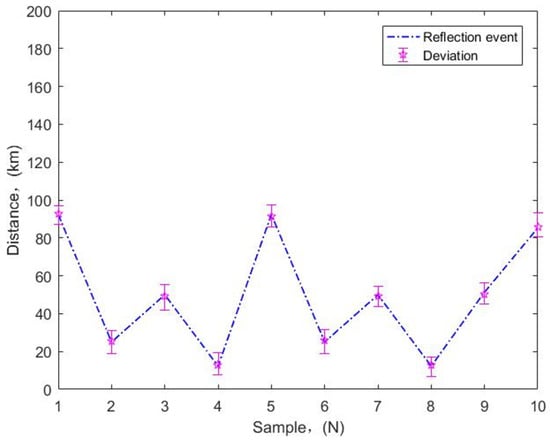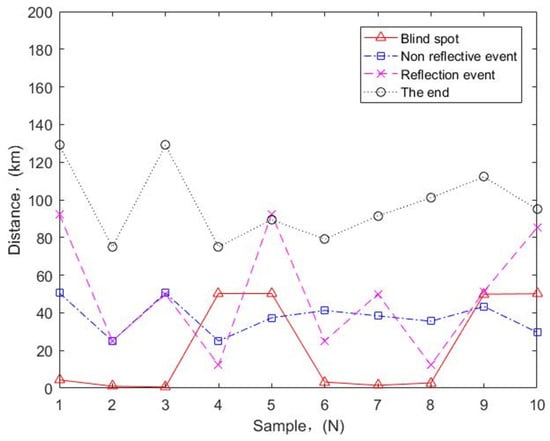 To further verify the accuracy of the model, we examine Figure 10 for further analysis of reflection events and obtain corresponding curves, as shown in Figure 11. Obviously, despite the large fluctuations of the reflected events, there is not much deviation for each reflected event point, which indicates that the positions of checked reflected events basically match the positions of the actual reflected events, which again verifies the high accuracy of the model proposed. It is worth noting that, although there is no regularity in the detection of reflection events, it does not affect application of the method proposed to the event detection of large span, unrepeatered fiber optic links at high altitudes. For example, if the fault point is observed through OTDR curve, there is an obvious Fresnel reflection peak. Then, compared with the data, if the distance from a certain joint is close, it can be preliminarily judged as an optical fiber fault in the box. Furthermore, if the distance between the fault point and the joint is large, it is a fault in the cable. It is worth noting that this article has combined the OTDR technology with wavelet transform to improve the accuracy of long-distance fiber fault location in a high-altitude environment for the first time, filling the technical gap in the field of optical fiber fault diagnosis in harsh environments, and expanding the fiber fault database.