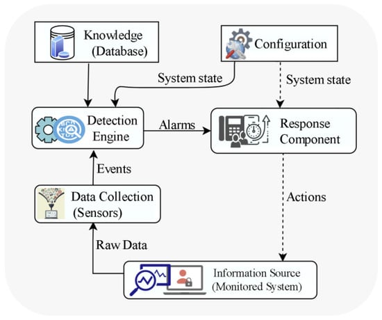 An intrusion detection system (IDS) detects malicious user’s unauthorized access to systems or networks. IDSs’ primary duties are to monitor hosts and networks, evaluate computer system activity, produce warnings, and respond to suspicious behavior. The basic architecture of an IDS, as shown in Figure 1 (adapted from [24]), consists of a data collection device (sensor), an intrusion detection engine, a knowledgebase (database), a configuration device, and a response component [25]. Based on different factors, IDSs can be classified into various types among which network IDS (NIDS) is widely deployed and our solution falls under this category. A Network Intrusion Detection System (NIDS) typically examines network traffic for patterns or anomalies that might reveal an intrusion. The NIDS is often deployed on the border router or switches and monitors network traffic flow to identify threats that occur across the network connection [26]. It operates on the OSI Model’s Network Layer or Data Link Layer. Most NIDSs are independent of the operating system (OS), allowing them to be used in various OS scenarios. Furthermore, NIDSs can identify specific protocol types and network assaults. The disadvantage is that they only monitor traffic moving via a certain network section.