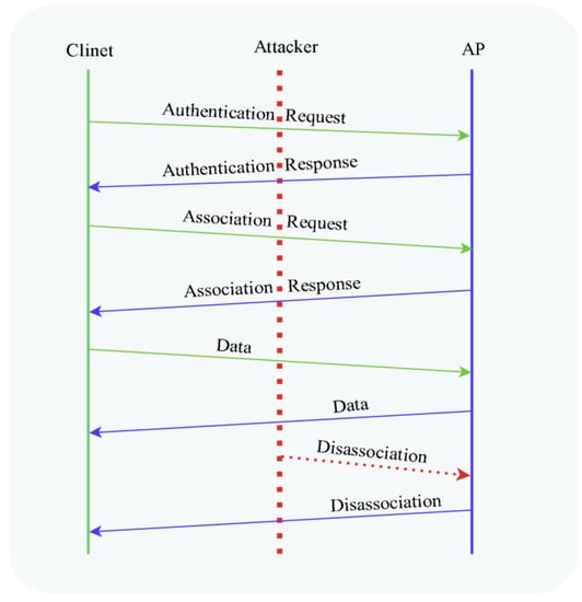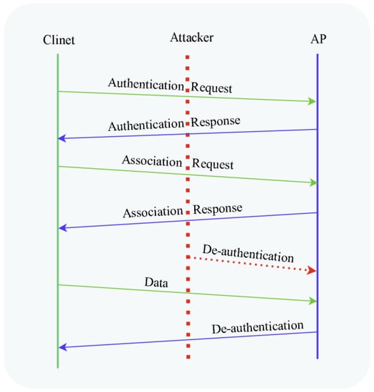 De-authentication attacks are classified as management frame attacks and fall under the Denial of Service attack which targets disrupting the communication between users (stations) and the Wi-Fi AP [37]. Normally, a de-authentication frame is used to gracefully end a connection between a connected client and an access point. The AP or the station can invoke the de-authentication due to shutdown, out of coverage, or other reasons. When the AP receives this frame, it also transmits the de-authentication frame back to the client. While this is a normal process for de-authentication, an attacker can take advantage of this process. An attacker exploits this regular process by first waiting for a client to authenticate with the AP and then launching attacks by spoofing the MAC address of a target client and sending the de-authentication frame to the AP on behalf of the victim. This disconnects the connection of the station to the AP. The attacker then spoofs this client’s MAC address and delivers the de-authentication frame to the AP. The entire process is shown in Figure 4 (adapted from [38]).