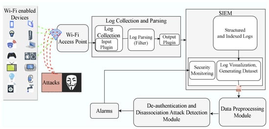 There is a need for more secure Wi-Fi networks [11] and several advancements have been made. The first approach is the innovation of Wi-Fi communication technology itself, including the latest security enhancement with Wi-Fi Protected Access 3 (WPA 3) [12], and performance enhancement with IEEE 802.11ax [13] (commonly called Wi-Fi 6). However, WPA 3 has potential flaws and vulnerabilities [14], one of which is vulnerability to Denial of Service (DoS) attacks aimed at disconnecting network devices, with de-authentication and disassociation included among such successful attacks. The other approach is the development and advancement of different intrusion detection systems (IDS), a vital cybersecurity technique, deployed to operate as a second security protection, monitoring and identifying unusual activities carried out by attackers that influence the availability of the Wi-Fi network. A number of machine and deep learning-based IDS solutions have been developed over the recent years to solve some of these problems [15,16,17,18,19,20,21,22,23]. For example, the authors of [15] identified different Wi-Fi vulnerabilities by carrying out various attacks and recommended strong encryption, employee training, and improving organizational security standards. In [17], the authors proposed a Wireless Intrusion Detection System to detect attacks on Wi-Fi networks while [14] introduced a WIDS to classify Wi-Fi traffic captured with n-grams into normal or malicious using machine learning models. Machine and deep learning-based IDSs can potentially offer better security by design, and therefore enhance the security of IoT Wi-Fi network infrastructures. However, the solutions mentioned above still face difficulties, including failing to achieve better performance, lacking up-to-date datasets, and not providing end-to-end solutions. Using old datasets can cause less effective attack detection as it may not capture the current state of Wi-Fi networks (including updated security protocols, authentication methods, or encryption standards), may fail to accurately represent the current attack landscape, and can miss already known vulnerabilities and weaknesses addressed by the latest security mechanisms. In addition, according to our knowledge, current solutions fail to provide an up-to-date end-to-end solution with real-time automated Wi-Fi network traffic analysis and attack detection mechanisms. Moreover, despite their rapid growth and importance, such security risks are not properly addressed in IoT systems such as smart home Wi-Fi network environments.