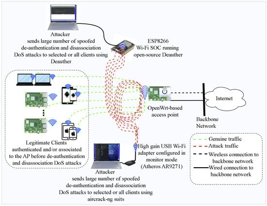 The Internet of Things (IoT) is a network of billions of interconnected devices embedded with sensors, software, and communication technologies with the capabilities of gathering and exchanging data via the Internet, allowing them to communicate with one another and execute a variety of functions independently. One of the important wireless communication technologies for establishing connections and enabling communication in IoT contexts is the IEEE 802.11 wireless local area network (WLAN) [1,2,3,4,5,6], commonly called Wi-Fi. It is one of the fastest-growing technologies and a widely deployed type of network due to ease of installation, flexibility, mobility, reduced cost of ownership, and scalability [7,8]. Devices in the IoT system face various security challenges including attacks launched to target different layers of the stack [9]. Wi-Fi-enabled IoT is deployed almost everywhere, ranging from common households to large-scale critical infrastructures with a rapidly growing number of devices such as smartphones, laptops, tablets, smartwatches, IoT devices, etc., along with the advancement and growth of various services such as cloud-based data storage, social networking, contented services, online banking, e-commerce, etc. However, due to the broadcast nature of the wireless signal on an open wireless medium, protocols, and mechanism design vulnerabilities, IoT Wi-Fi networks are exposed to various attacks from hackers and intruders. The insecurity of these Wi-Fi-enabled IoT devices is increasingly growing as they become easy targets of various attacks. De-authentication and disassociation DoS attacks are among those security challenges where attackers can easily spoof the MAC address of the client or the AP while they are in the process of genuine authentication/association and de-authentication/disassociation by carrying out an attack on their behalf which can result in turning down the Wi-Fi network and denying services. Common Vulnerabilities and Exposures (CVE) recorded a number of de-authentication and disassociation attacks carried out against different Wi-Fi networks and environments [10].