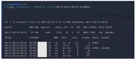 Thus, the attacks in this work are carried out using these two sets of different tools. The Kali Linux-based Aircrack-ng suite of tools attack is carried out by setting up the latest Kali Linux distribution in VirtualBox, setting up an Atheros AR9271 adapter, and enabling monitor mode using the Airmon-ng of the wireless network card. Then, scan for nearby available access points and their associated clients by listening (sniffing) to 802.11 beacon frames broadcasted by nearby wireless routers or access points. Airodump-ng is used for this purpose which displays a list of detected access points, and also a list of connected clients which includes every access point in the area. From the list of available APs, identify the network where authorization to perform a penetration test is granted, as shown in Figure 8. Identifying target clients that are connected to the target AP is our next step, where both of them are monitored as shown in Figure 9.