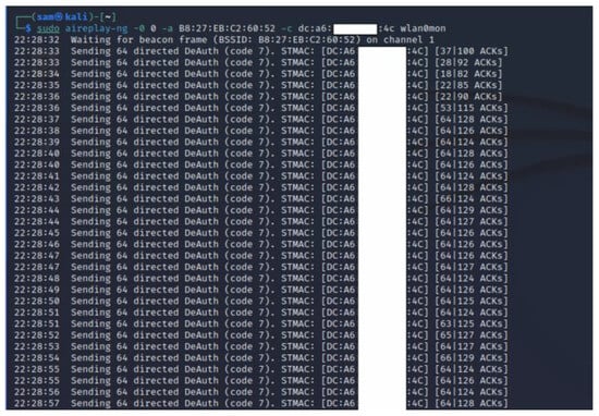 The cost of hacking Wi-Fi has dropped considerably, and low-cost microcontrollers are increasingly being transformed into inexpensive yet strong hacking tools. For a variety of reasons, such attacks are increasingly becoming inexpensive even for non-experts. The NodeMCU ESP8266, an Arduino-programmable chip on which the Wi-Fi Deauther project [51] is based, is one of the most popular. With a very user-friendly and easy web interface, a hacker may establish false networks, clone actual ones, or block all Wi-Fi in an area using this low-cost hardware. Thus, the de-authentication and disassociation attacks in this work were conducted using Aireplay-ng and ESP8266 NodeMCU. Aireplay-ng is part of the Aircrack-ng tool suite that consists of many tools used for Wi-Fi security and comes pre-installed inside the Kali Linux open-source distribution. A AR9271 chipset-based Alfa wireless adapter with monitor mode and packet injection capability is used in this process.