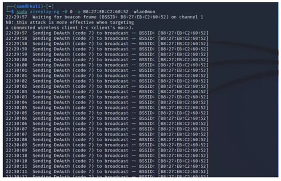 Finally, carry out de-authentication/disassociation attacks using another Aircrack-ng suite tool called Aireplay-ng as depicted in Figure 10 (single client) and Figure 11 (multiple clients). Aireplay-ng is a wireless frame injector included in the Aircrack-ng package. Its primary function is to generate traffic for use in Aircrack-ng to crack encryption keys. Several attacks in Aireplay-ng can de-authenticate and disassociate wireless clients in order to capture encryption data, including fake authentications, interactive packet replay, hand-crafted ARP request injection, and ARP request reinjection. When carrying out an attack by targeting a single client, a directed de-authentication is sent to the specific MAC address, while attacking all the connected clients involves sending the de-authentication/disassociation attacks as broadcast frames which disconnects all of them from the victim AP.