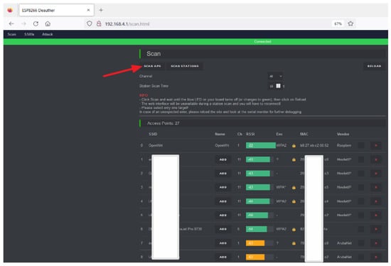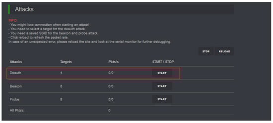 The de-authentication/disassociation attacks carried out by ESP8266 NodeMCU Deauther are similar to the above-described steps with Kali except that the procedures are automated through a graphical web interface. Connect the ESP8266 NodeMCU to the laptop’s USB port. Then connect to the ESP8266 NodeMCU Deauther’s Wi-Fi and access it on the browser using its IP address, as shown in Figure 12. Once in the GUI of the deauther, scan for available nearby APs and clients. Select a single or multiple or all of the clients connected to the victim AP and launch the attacks, as shown in Figure 13 and Figure 14.