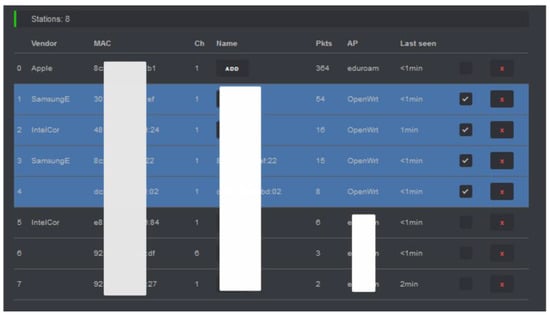 This module consists of Wi-Fi client devices, an attacker, and an AP as shown in Figure 7. Smartphones, tablets, laptops, and Raspberry Pi (RPI) are used to generate normal traffic while Kali Linux and NodeMCU-based clients are used to carry out attack traffic. We used RPI to represent other IoT Wi-Fi-enabled IoT devices. Wi-Fi hacking has always relied on a few pieces of hardware, such as a computing device (computer, laptop, Raspberry Pi, etc.) that can execute whatever attack application is attempted. Second, it requires a wireless network adapter with a chipset that supports whatever nefarious Wi-Fi behavior is to be conducted.
