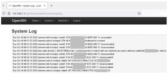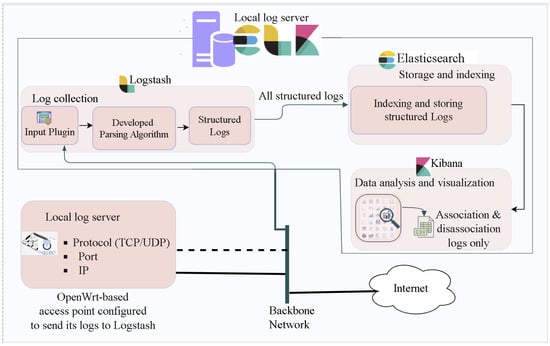 Network devices such as home Wi-Fi APs routinely generate a huge number of logs to record their states and runtime information, each comprising a timestamp and a log message indicating what has happened [52]. This valuable information could be utilized for multiple purposes, among which this study focuses on attack detection with a focus on association and disassociation logs. The log collection involves configuring the AP to send its logs to a central server for further usage and processing. The architecture for the testbed for log collection, parsing, indexing and storing, analysis and visualization to generate a dataset is shown in in Figure 15. It collects Wi-Fi traffic data from the access point with OpenWrt firmware installed on Raspberry Pi B+. OpenWrt is a Linux-based open-source project for embedded operating systems primarily used on embedded devices to route network traffic [53,54]. The OpenWrt system logging function is a crucial debugging and monitoring capability. The OpenWrt-based AP is configured to send its logs to the remote server (ELK server) including the remote server’s protocol (TCP/UDP), IP, and port. The message format in OpenWrt-based AP varies depending on the destination (local log read, local file, remote socket) but it is generally represented as follows: