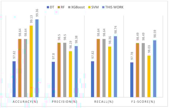 In the solution proposed by Satman et al. [18], a Wireless Intrusion Detection System (WIDS) uses an anomaly behavior analysis approach to detect attacks on Wi-Fi networks with a 99% detection rate and 0.1% false alarm rate. The approach models the normal behavior of the Wi-Fi protocol using n-grams, which are used to capture continuous sequences of n items, and uses machine learning models to classify Wi-Fi traffic flows as normal or malicious. The approach has been extensively tested on multiple datasets collected locally at the University of Arizona and the AWID family of datasets. The study by Thing et al. [22] provides a deep learning strategy for detecting anomalies and classifying attacks in IEEE 802.11 networks. To detect network anomalies and properly classify attacks, the suggested system employs a self-learning methodology. The approach is based on a deep neural network architecture known as a stacked autoencoder (SAE). The SAE is trained on the dataset to learn the characteristics required for the accurate detection and classification of network anomalies. The classification is regarded as a multi-class problem, and the suggested approach classified the attacks with an overall accuracy of 98.6688%, which shows that our solution performs better. The paper [23] proposes an intrusion detection system for wireless networks using a feature selection algorithm called conditional random field and linear correlation-coefficient-based feature selection algorithm. The proposed system achieves an overall detection accuracy of 98.88%. However, this solution has insufficient performance, and no comparison is made with other existing IDSs, which could provide a better understanding of its effectiveness in comparison to other methods.