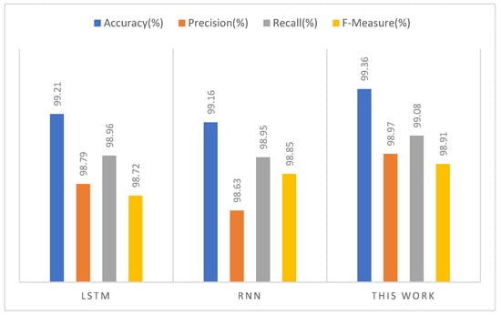 Several variants of DL models have been implemented to address intrusion detection classification problems. We consider LSTM and RNN models in our comparison analysis because of their wider application and optimal performance and their performance results is shown in Table 12 and also elaborated using Figure 24.