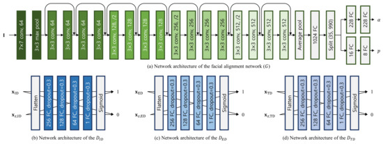 Detailed architecture of the facial alignment network G, identity displacement discriminator DID, expression displacement discriminator DED, and temporal displacement discriminator DTD.