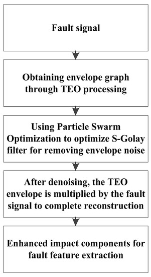 As shown in Figure 1, in the absence of noise, the amplitude of the simulated signal after TEO processing increases, and the reconstructed signal structure remains unchanged. As shown in Equation (9), the amplitude of the reconstructed signal increases by multiplying the cubic power of the original amplitude by the square of the frequency, greatly increasing the impact component in the signal. But in the noised impulse signal, it is obvious that there is noise on the TEO envelope, and the reconstructed signal cannot distinguish the complete impact signal components. Therefore, for signals with noise, filtering processing is required after TEO processing. The S–Golay filter is a principle that uses the least squares method to fit curves for filtering. Using the S–Golay filter, the high frequency noise can be removed, and the low-frequency TEO envelope components can be retained; thus, the smooth TEO envelope can be obtained.