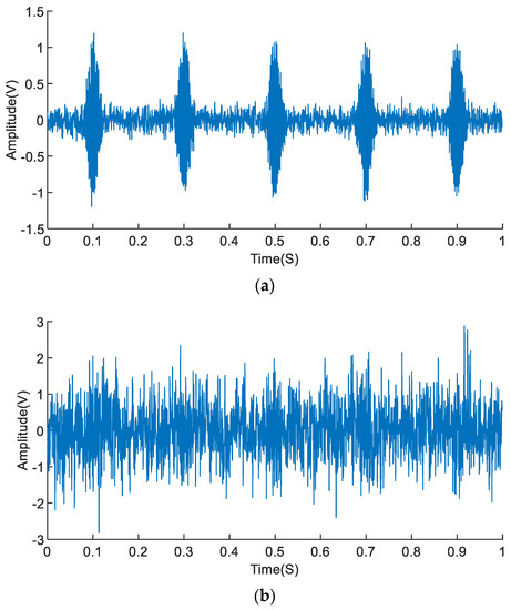 where is the periodic attenuation shock signal with a frequency of 5 Hz, is the noise intensity, is Gaussian white noise with a mean of 0 and a variance of 1. The sampling frequency is 2000 Hz, and the sampling point is 2000. Two sets of simulated signals with different D are shown in Figure 4.