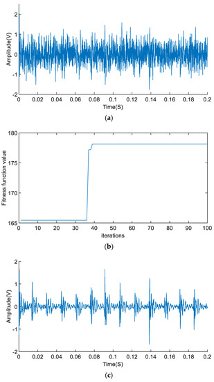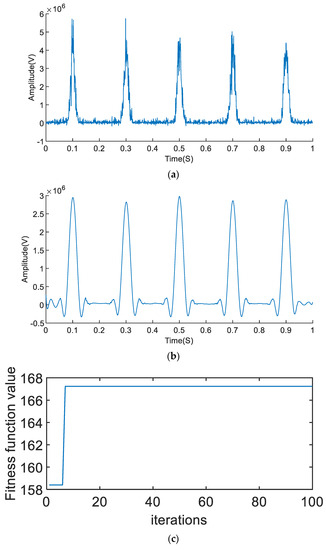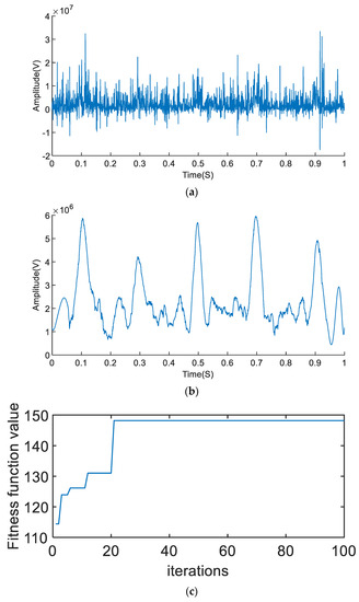 Figure 5 shows that when the noise intensity is not great, the TEO signal is close to the ideal signal, and the S–Golay filter based on PSO reaches the optimal value at the 7th iteration. The filtered TEO and reconstructed signal both express the good performance of the proposed method. Compared to Figure 6, the reconstructed signal in Figure 5 performs better in similarity and accuracy.