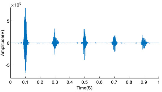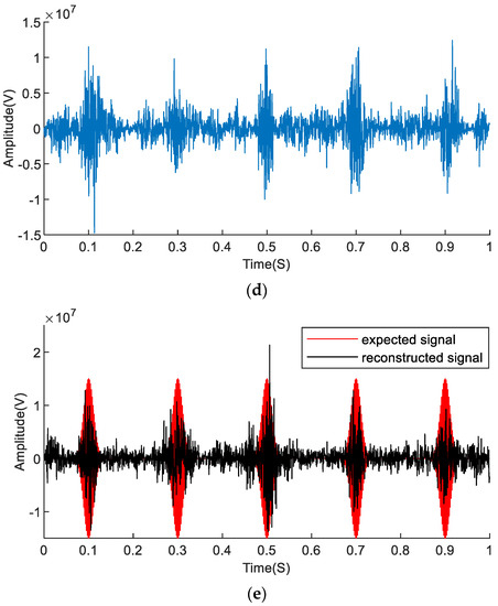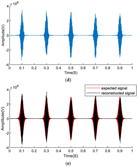 As shown in Figure 5e, the comparison between the reconstructed signal and the simulated signal shows that only the attenuation coefficients of the two signals are different. As shown in Equation (6), only is different between the two signals, while the other three factors , , are exactly the same. As shown in Equation (6), the reconstructed signal attenuation coefficient increases three times compared to the original signal. As shown in Figure 7e, only the attenuation coefficient of the impact in the signal has changed, but the overall impact has not changed, and the signal still has noise components after reconstruction.