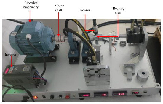 The experimental data were obtained from the BTS100 experimental platform. The experiment used electric discharge technology to process a single-point groove on the bearing to simulate early faults. To simulate early fault signals, this article set the signal sampling frequency to 10 kHz, and the motor speed to 600 r/min. The BTS100 experimental platform is shown in Figure 9. It can be seen that the experimental platform consists of the electrical machinery, frequency converter, motor shaft, bearing seat, sensor, etc.