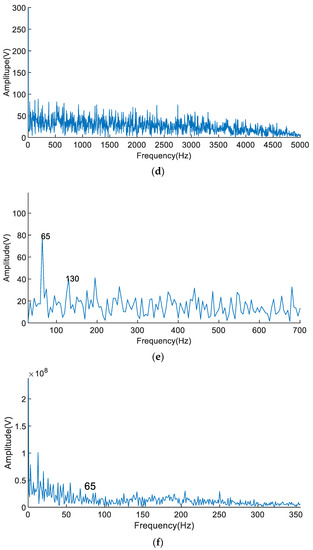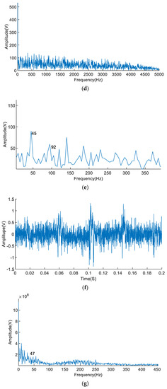 The vibration data and waveform are obtained when the outer ring of the bearing is damaged. The sampling frequency is 10 kHz, and the sampling point is 2000. A fault with a depth of 1.2 mm and a width of 0.6 mm was artificially machined on the outer ring of the rolling bearing using a wire cutting method. As shown in Figure 10f, when the store’s speed is 300 r/min, the fault signal characteristics are not obvious and are completely submerged in the noise. Therefore, a signal with a motor speed of 600 r/min was selected as the experimental object. The theoretical outer ring fault characteristic frequency is 47 Hz. Figure 10 shows the results of the outer ring fault.