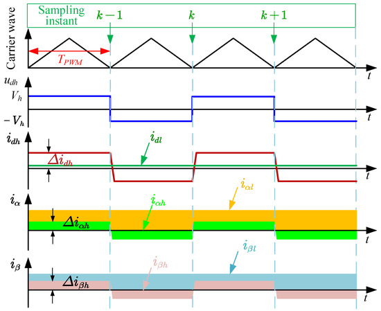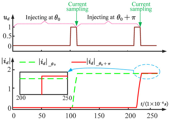 where represents the amplitude of the injected square wave. From Equation (5), the square wave of equal amplitude, equal width and reverse injection in the d-axis ensures that the mean value on the time scale is 0, which can further reduce the influence of the injected signal on torque. The response current during square-wave injection can be briefly described in Figure 1.