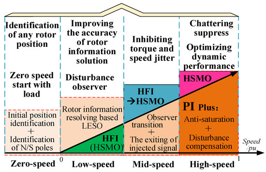 To realize sensorless control in the full-speed range, a composite sensorless scheme of square-wave voltage HFI and HSMO is proposed. On the one hand, The signal injection method can compensate for the issue of low back-EMF signal-to-noise ratio in an HSMO at low speeds. On the other hand, the high-speed range uses an HSMO to avoid the problems of inaccurate high-frequency excitation signals and high energy consumption. Among them, the smoothness in the switching process of different observers also has a great influence on the running state of the motor. What is more, the anti-load disturbance performance and the accuracy of rotor position identification are also crucial in the process of sensorless operation. In addition, the ability to start with a load at zero speed is also required for many sensorless control applications in any position. Therefore, the entire sensorless control scheme is divided into four speed domains for specific analysis, which are summarized as zero speed, low speed, medium speed and high speed and are described in Figure 4.