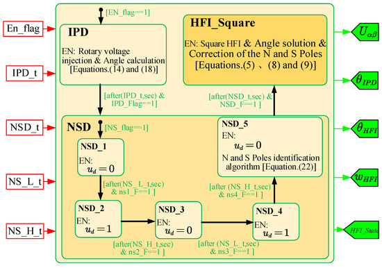 Through the above analysis and design, the rotor position detection scheme at zero speed is divided into three links, including IPD, NSD and square-wave HFI. In order to meet the accuracy of square-wave HFI at the start time, the square-wave HFI can be put into operation before the motor starts. The zero-speed rotor position detection can be described in Figure 7 by using stateflow.