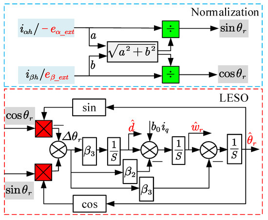 In addition, in order to avoid the influence of magnitude from the EEMF and high-frequency response current, it is necessary to normalize the input signal of the LESO. Therefore, the block diagram of the normalized LESO can be designed in Figure 8.