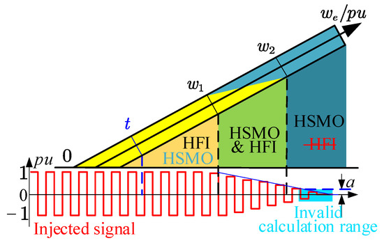 In order to achieve higher reliability at high speed and low speed, it is necessary to propose a smooth transition strategy to avoid the vibration of PMSM speed and torque. Therefore, a linearly weighted observer switching strategy is proposed in the medium-speed phase. Then, in order to further suppress the jitter caused by the exit of the injected signal, an exit mode in which the injected signal is linearly attenuated is added to the linearly weighted switching strategy, and its switching principle is shown in Figure 9.