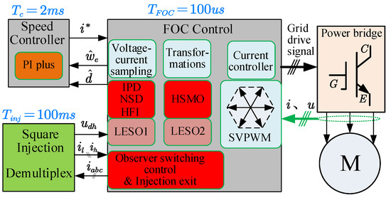 Based on the above derivation and design, the block diagram of the full-speed sensorless control system for the PMSM is established in Figure 11. Here, the parts, including the current loop, SVPWM algorithm, rotor information identification, observer switching algorithm and sampling, are executed at a frequency of 10 kHz. To make the best use of the MCU’s computing resources, the speed loop is implemented at a frequency of 200 Hz.