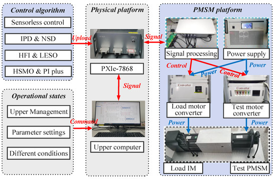 Inspired by the above, this paper first designs a sensorless control scheme in the full-speed range. Here, a method of rotating voltage HFI is designed in the zero-speed stage to reduce the impact of injection amplitude, frequency and motor parameters. Secondly, an NS pole judgment scheme is designed to correct the results of the rotor identification to ensure reliable convergence of the observer. Then, the extended back electromotive force (EEMF) is introduced into the state variable to construct a high-order sliding observer (HSMO) to suppress the phase lag and output chatter problems of the traditional SMO. In addition, a linear extended state observer (LESO) is designed to acquire rotor information and system disturbance. On this basis, a novel PI controller is designed, called PI plus, by considering the integral saturation phenomenon and insufficient anti-disturbance performance of traditional PI controller. Here, the reverse control link and a disturbance feed-forward compensation link are established. Finally, an observer switching algorithm based on linear weighting and a linear exit scheme of the injected signal are designed to achieve more stable composite control.