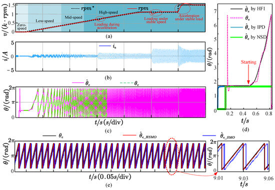 In Figure 13a,b, the control performance of the proposed sensorless strategy in the full-speed threshold is verified under the cases of fixed load, variable load and speed. From Figure 13c, it is worth noting that the HSMO effectively avoids the phase delay compared with the traditional SMO. Furthermore, Figure 13d reveals that the IPD process can accurately identify the initial position of the rotor when it is positioned at 45°. On this basis, the NSD strategy can precisely detect the polarity of the rotor, which further ensures that the HFI strategy can properly provide the rotor information to achieve a stable speed change response during startup. Finally, Figure 13e presents a comparison between an HSMO and a conventional SMO in terms of rotor angle estimation results. Here, the function of “arctan” is employed for angle calculation. And represents the expected value of speed. The results reveal that a conventional SMO introduces significant phase lag and severe oscillation phenomena. In comparison, an HSMO can effectively suppresses both oscillation and phase lag phenomena.